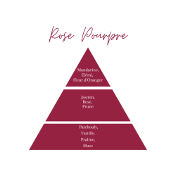 Intense and passionate, Rose Pourpre reveals a floral and gourmand fragrance. Fruity notes of mandarin and orange blossom open onto a rich heart of rose, jasmine, and plum, before revealing a warm and sensual base of vanilla, patchouli, praline, and musk.
