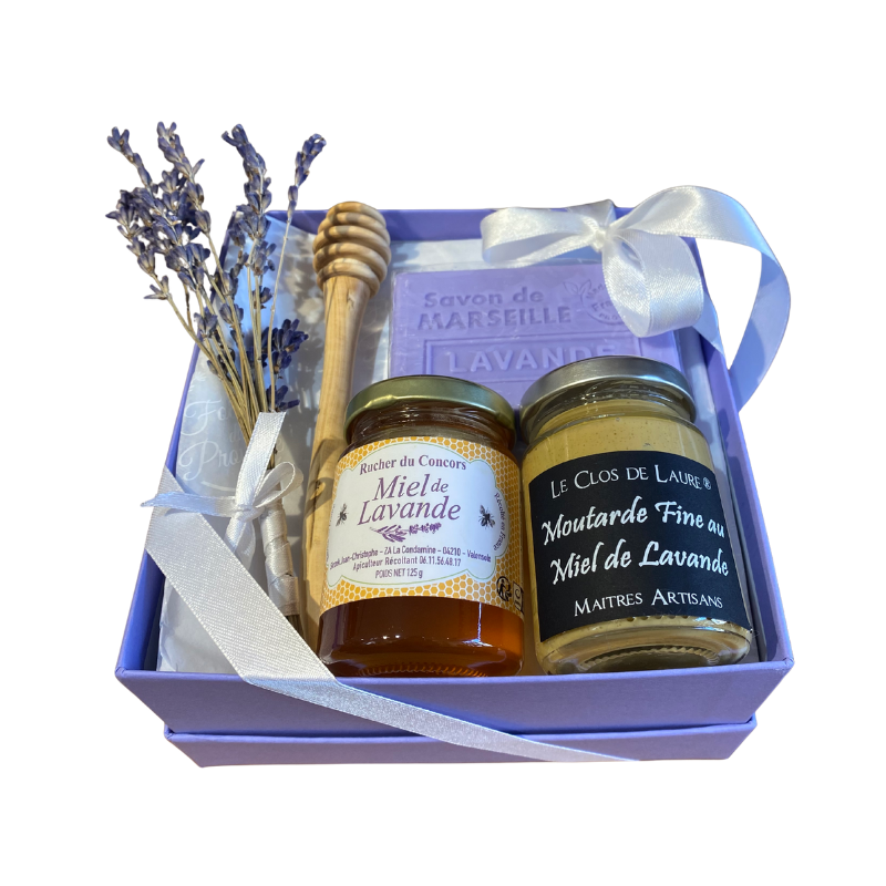 It includes delicate lavender honey, a fine honey mustard with sweet and refined flavors, a wooden honey spoon for elegant serving, and lavender Marseille soap to prolong the sensory pleasure.