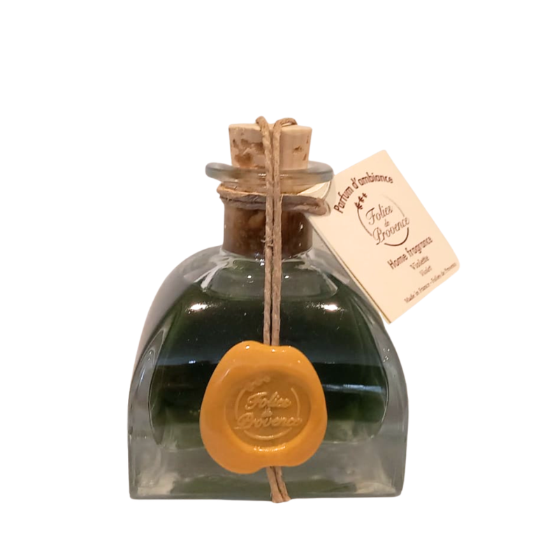 Ce parfum d'intérieur est contenu dans un flacon en verre avec tiges de rotin, scellé d'un sceau de cire frappé à la main et estampillé Folies de Provence.