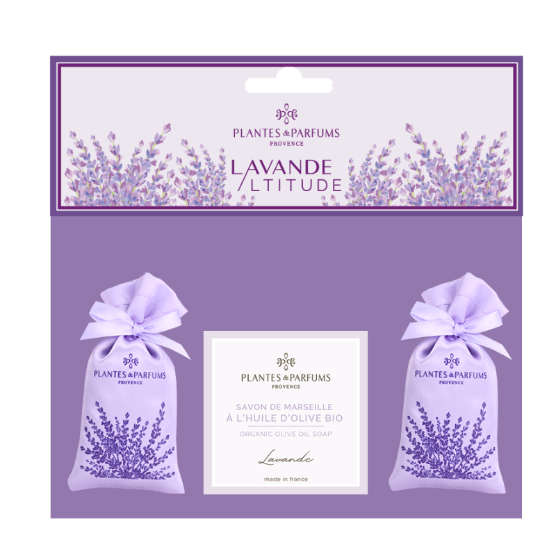 Portate un tocco autentico di Provenza nella vostra casa grazie a questo elegante assortimento profumato composto da due sacchetti di raso con fiori di lavanda e un sapone arricchito con olio d'oliva biologico, delicatamente profumato alla lavanda.