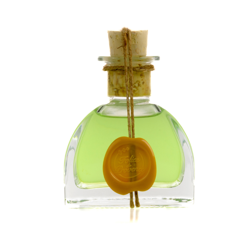 Questa fragranza Verbena è contenuta in un flacone di vetro con stelo in rattan, sigillato con un sigillo di cera impresso a mano e con il timbro Folies de Provence.